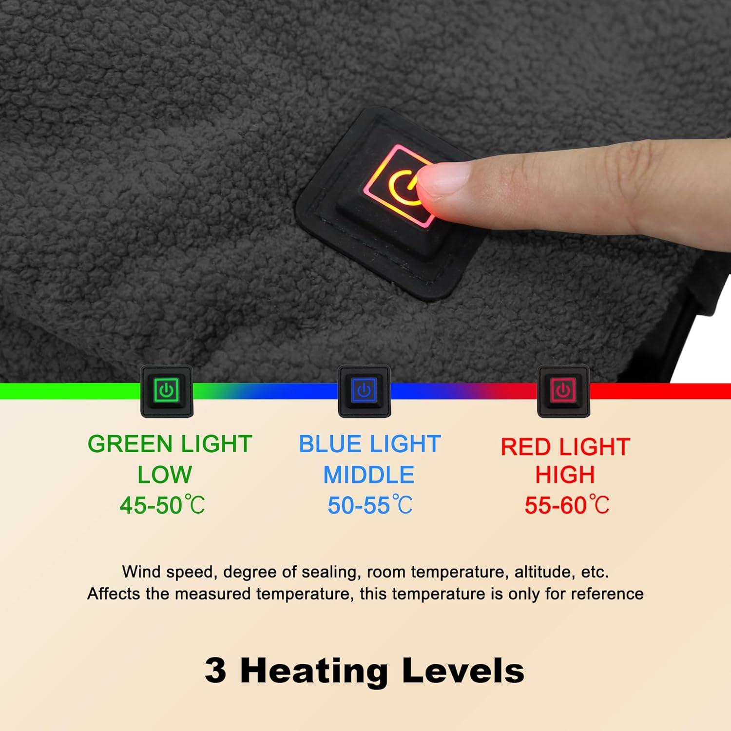 3 Kinds Heating Level Mode: 3 kinds of heating level modes for you to select the suitable heat output as you need by simply pressing the power button, USB power supply. The first one is “High/Red”, the second one is ” Medium/Green”, the last one is “Low /Blue”.